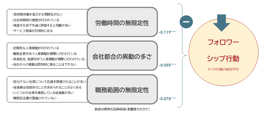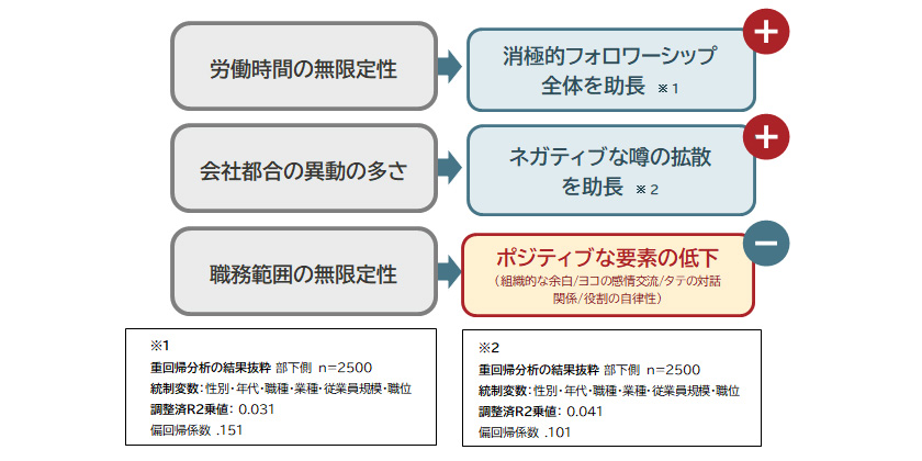 詳細を分析すると、「労働時間の無限定性」は消極的フォロワーシップ行動全体とプラスの関係が見られ、「会社都合の異動の多さ」は、ネガティブな噂の拡散を助長し、「職務範囲の無限定性」は先述のポジティブな要素(ヨコの感情交流/タテの対話関係/役割の自律性/組織的な余白)を低下させている。