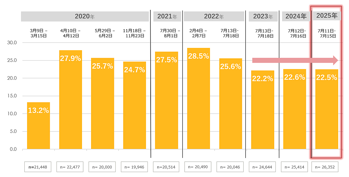 2025年7月時点のテレワークの実施率は、正規雇用社員(以下、正社員)22.5%。2024年同時期の22.6%とほぼ横ばい。2023年以降、全体的なテレワーク実施率は安定的な定着傾向を見せている。