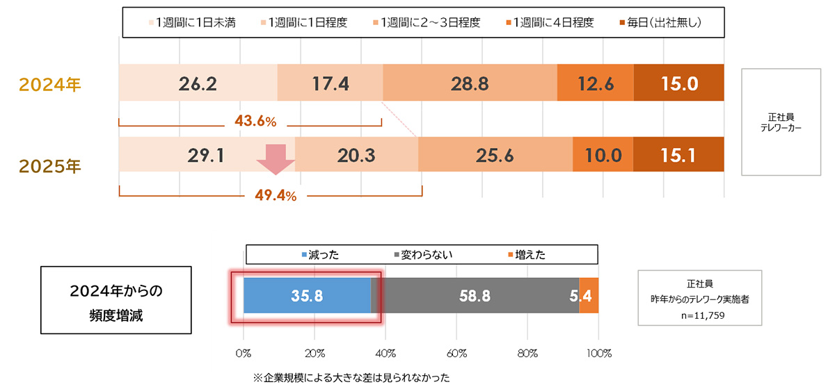 一方で、テレワークの「頻度」に注目すると、やや減少傾向が見られる。2024年からの変化を尋ねた設問において、「テレワークの頻度が減った」と回答した人は35.8%に上り、増加傾向よりも明確に多い。