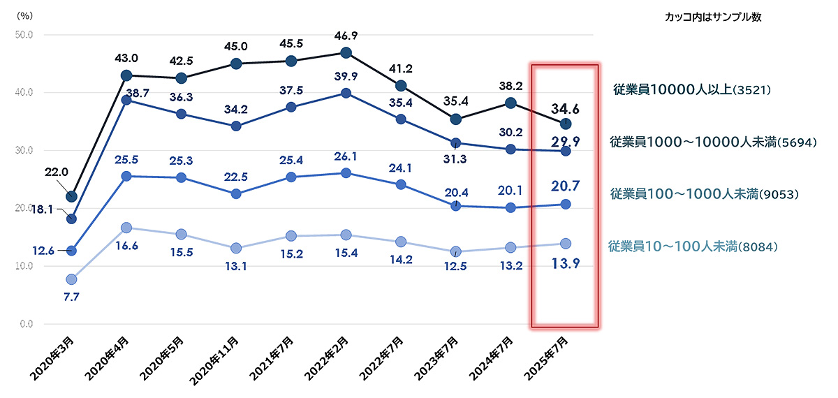 企業規模別にテレワーク実施率の推移を見ると、従業員10,000人以上の大手企業において、2025年7月時点のテレワーク実施率が34.6%で、2024年同時期の38.2%から3.6ポイント減少した。