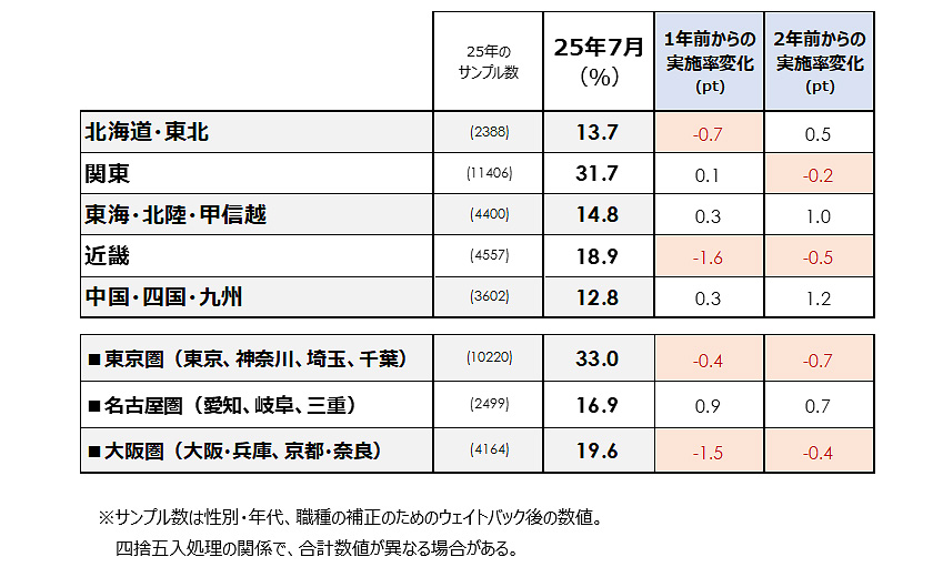 地域別にテレワーク実施率を見ると、関東圏が31.7%で最上位。大きな変動はない。