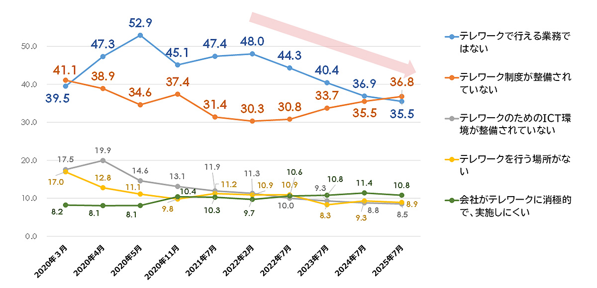 テレワークを実施していない理由の1位は「テレワーク制度が整備されていない」 で36.8%。経年変化を見ると、「テレワーク制度が整備されていない」が継続的に上昇し、「テレワークで行える業務ではない」を逆転した。