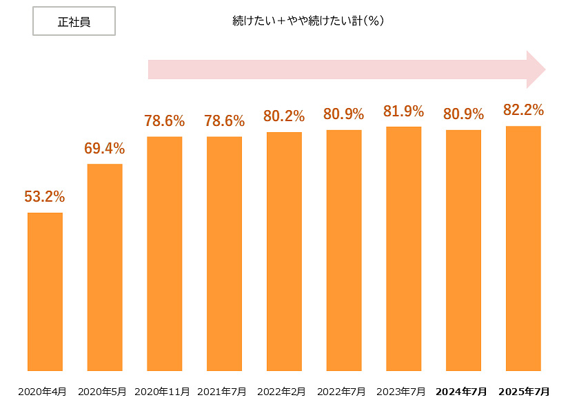 テレワーク実施者に、今後のテレワーク希望を聴取した。「続けたい」計は82.2%と過去最高。2020年後半以降、高止まりの状態が続いている。