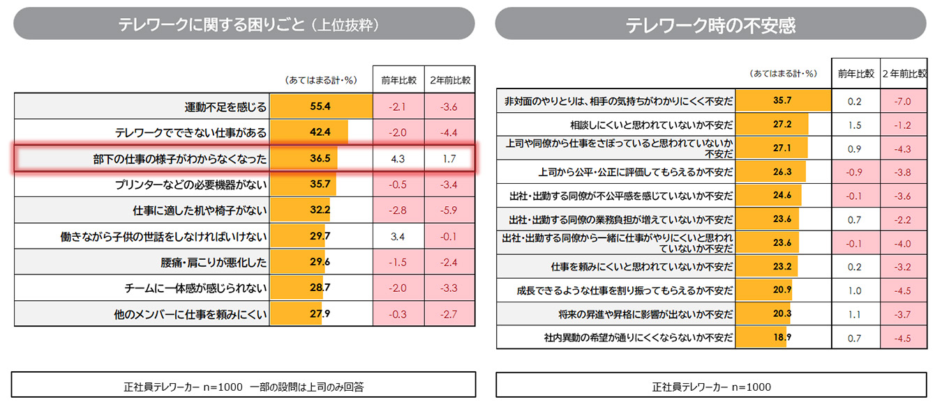 また、テレワークへの慣れが進み、テレワーク時の困りごと(デメリット)は徐々に減少している中、マネジメントに関する課題は依然として解決されていない。上司が部下の仕事の様子が見えないという課題が、テレワークが普及した2020年から5年経っても残存している様子がうかがえる。