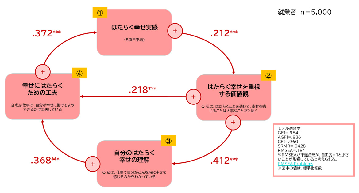 直近の①「はたらく幸せ実感」を起点として、②「はたらく幸せを重視する価値観」が醸成され、③「自分のはたらく幸せの理解」が深まる。価値観醸成、幸せの源泉の理解が深まることで④「幸せにはたらくための工夫(クラフティング)」が促進され、その結果更なる①「はたらく幸せ実感」が獲得される。