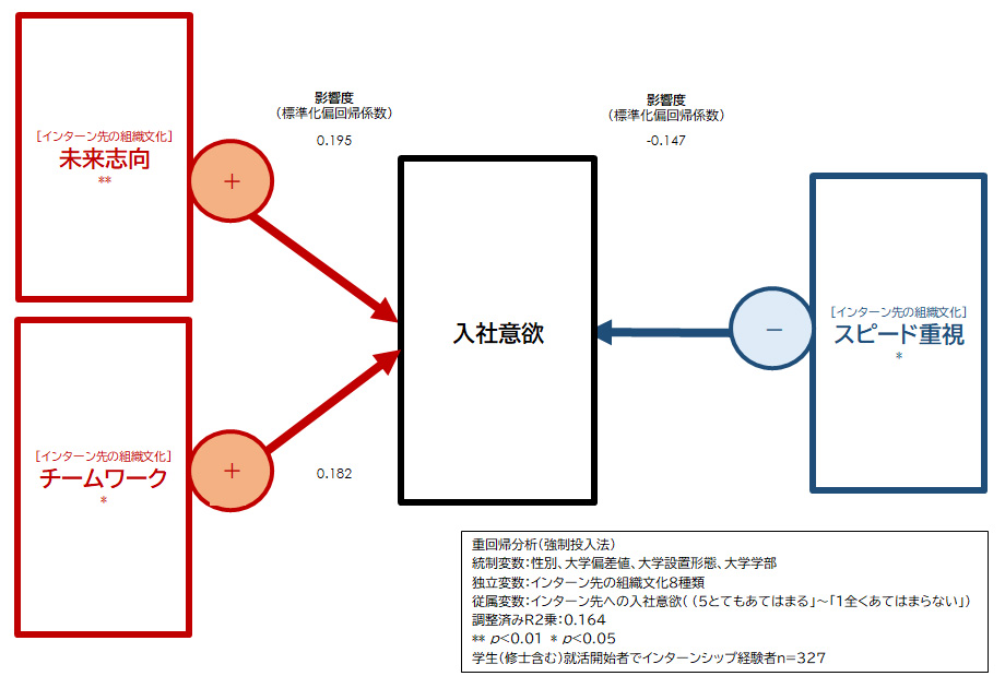 「未来志向」は、長期的視点で考えること、利益と同じくらい社会的責任を重視するということ、「チームワーク」は、チームとしてまとまっている、団結して目標に向かっていく雰囲気があるということ、「スピード重視」は、考えるよりも先に行動することを重視し、粗くても迅速な意思決定を重視するということを意味する。すなわち、学生はインターンシップで「この企業は目先の利益や迅速さばかりを追求するのではなく、先を見据えて事業・仕事を行っており、社員同士のチームワークもよい」と感じると、「この企業に入りたい」と思うのだ。