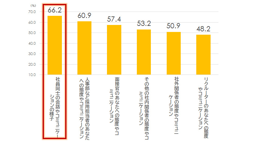 それでは、そうした組織文化はどういった部分から見られているのであろうか。それを見たのが図表4である。最も回答率が高いのは、「社員同士の会話やコミュニケーションの様子」である。それに、社員の自分に対する態度やコミュニケーションが続く。学生は、社員が自分に示す態度やコミュニケーション以上に、社員同士の態度やコミュニケーションを観察することを通じて、「この企業はどのような文化なのか」を推測しているのだ。