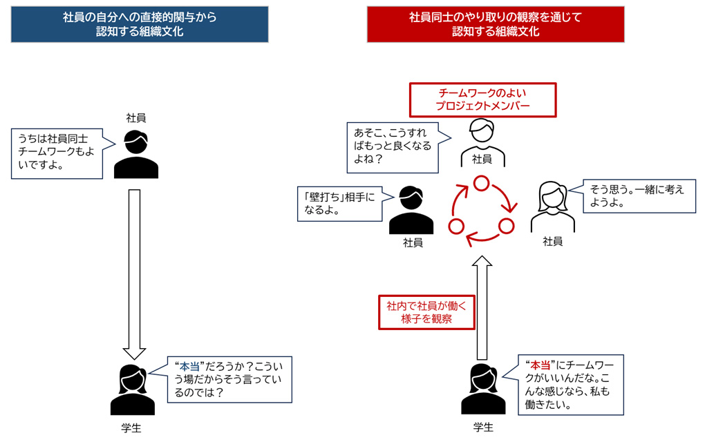 このうち、学生がより強く組織文化の真正性(オーセンティシティ)を感じるのは、②の「社員同士のやり取りを観察する」パターンだと考えられる。このやり取りは、学生に向けられたものではないがゆえに、演出されていない本物の姿として映りやすい。例えば、活発に意見を交わしながらも互いを尊重し合うプロジェクトメンバーの様子を目の当たりにすれば、学生は「この組織は本当にチームワークが良いのだな」と、より確信を持って組織文化を感じると思われる。