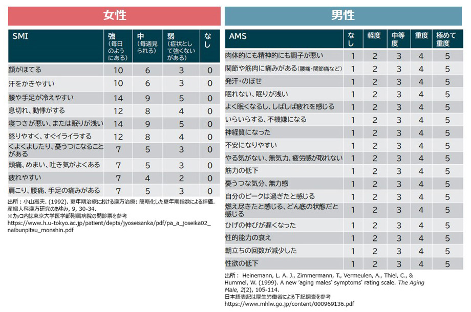 なお、このスコアは本人の自覚症状に基づく目安であり、医療的な診断とは異なる点に注意が必要である。更年期障害の診断には、閉経状況の確認や他の疾患の除外が必要とされる。