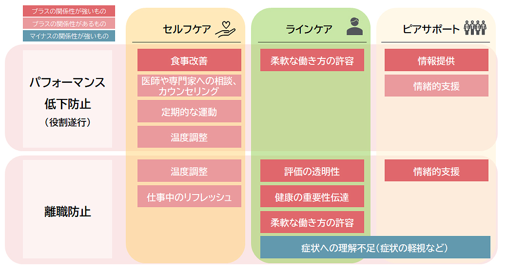 特筆すべきは、本人のセルフケアに加え、上司や同僚の関与が仕事のパフォーマンスと離職意向に大きな影響を及ぼしている点である。職場における支援の有無は、パフォーマンスや継続就業を大きく左右する要因となっている。これは人事や上司にとっても、看過できない課題である。