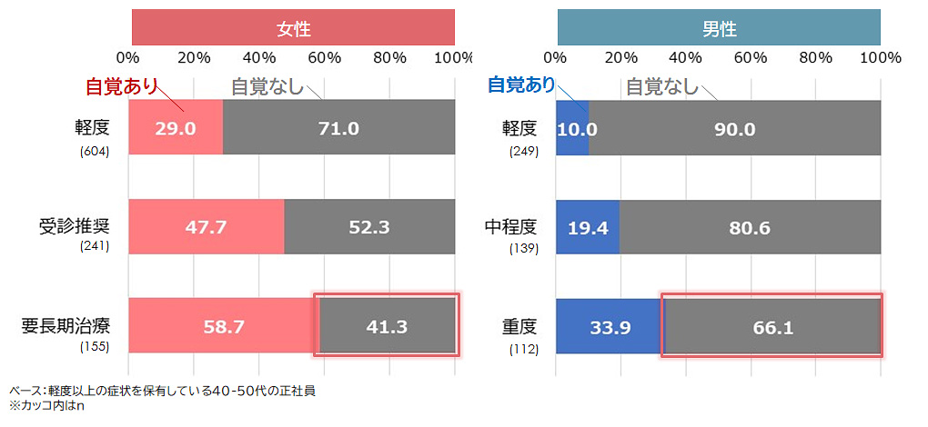 更年期の問題に対応する上で最も大きな壁のひとつが、本人がその不調を更年期によるものと自覚していない点である。更年期の始まりが曖昧であることもあり[注2]、自分の不調が更年期によるものだと気づかない人も多い。実際、要長期治療レベルの女性の4割以上、重度レベルの男性の7割近くが更年期症状であることを自覚していなかった(図表2)[注3]。