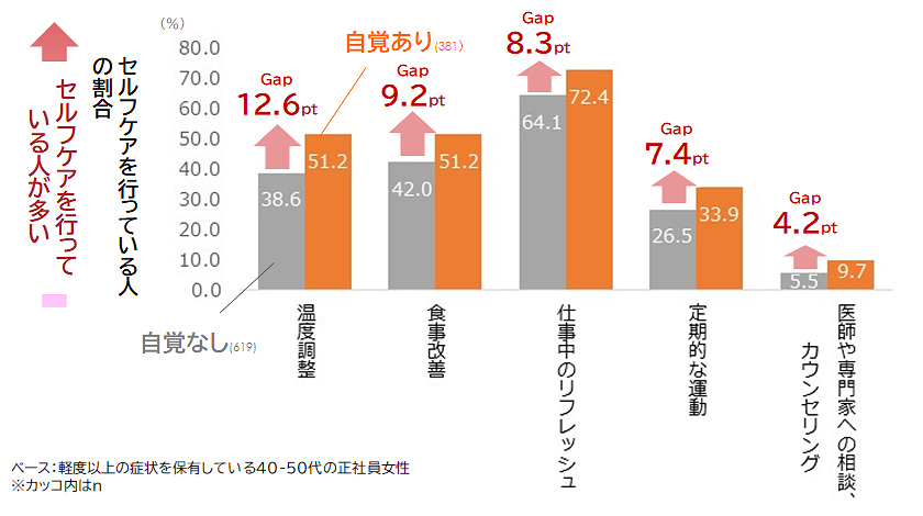 こうした「気づきの壁」は、セルフケアを実践する上での大きな障害となる。更年期を自覚している人は、自ら温度調整や食生活の見直し、リフレッシュなどの対処を行う傾向があるが(図表3)、自覚のない人は対処に至らず、結果として仕事のパフォーマンスに支障が出やすい。