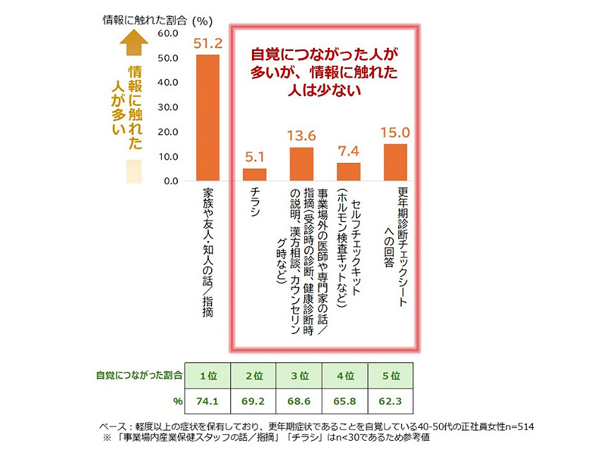 だからこそ、企業としては、まず本人が気づくように後押しする必要がある。具体策としては、更年期チェックシートの配布やセルフチェックキットの周知、専門医の紹介、チラシの配布などが挙げられる。これらは、自覚につながりやすい事柄であるにもかかわらず、実際にそれらに接している人は少ない(図表4)。そのため、企業の支援策としてこれらを提供することには大きな意味がある。