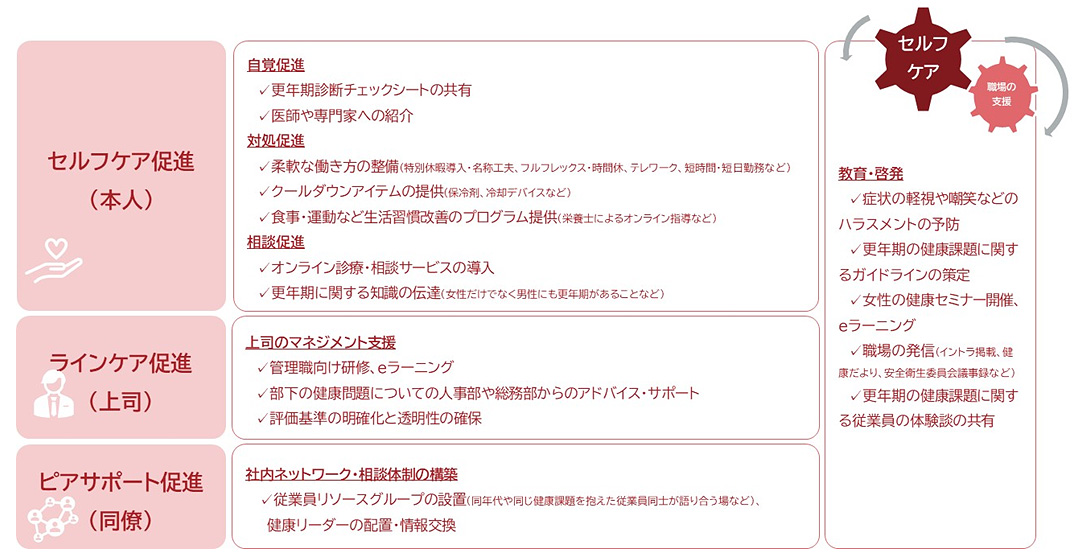 更年期支援を企業として取り組む際は、「セルフケア」「ラインケア」「ピアサポート」の三本柱で考えると整理しやすい。いずれも制度や環境の整備だけでなく、現場で実際に使われる状態にすることが要となる。