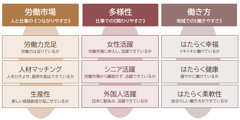 われわれは、地域の「はたらく」を多角的に捉えるため、「労働市場」「多様性」「働き方」という観点から、計9つの指標を設計した(図表1)。