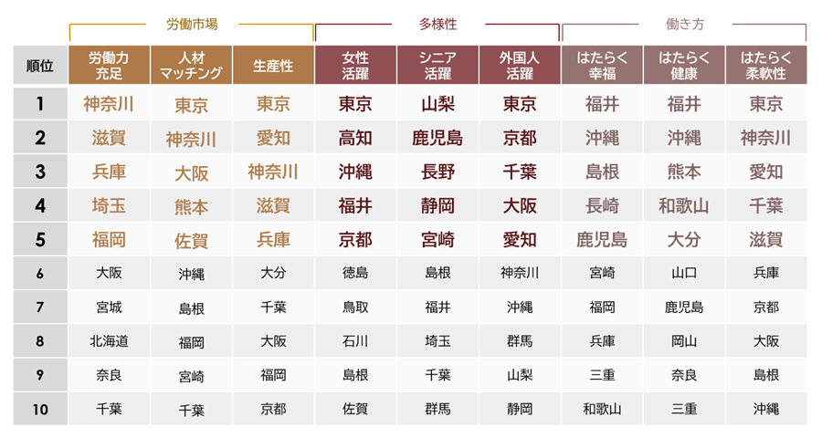 その対極にあるのが、「はたらく幸福」「はたらく健康」で2冠を獲得する福井県だ。福井県は労働市場や多様性の指標ではトップクラスではない。しかし、働く人の幸福感や心身の健康といった、個人の内面的な充足度において極めて高い水準にある。これは、経済的な効率性や規模の拡大とは別の軸に、豊かな「はたらく」の形が存在することを示す好例であろう。