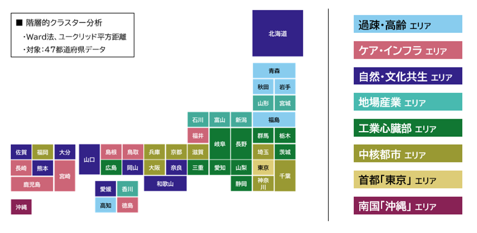 47都道府県がそれぞれ異なる個性を持つことは、ランキングが示す通りだ。しかし、一見バラバラに見える個性も、いくつかの「共通の性質」で括り出すことができる。人間の性格をいくつかのタイプに分類することで、その人の行動原理や思考のクセが見えてくるように、都道府県の「はたらく」の性質を分類することで、より深い構造的課題が浮かび上がってくるのだ。