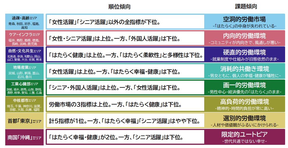 「はたらく」に関わる9つの指標を基に、47都道府県の構造を分析した結果、日本は8つのエリアタイプに分類できることが分かった(図表3)。なお、各エリア名は、そのグループを構成する県の産業構造や人口規模といった、基礎情報に関する共通点を基に命名している。