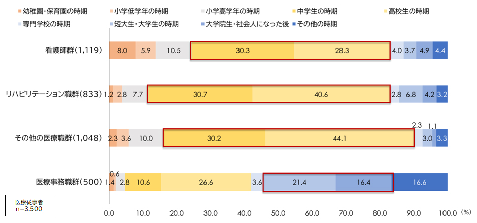 担い手不足の背景には、医療を志す若者そのものの減少という根本的な課題がある※2。また、志す時期は職種によって異なるため、働きかけの設計も職種別に最適化する必要がある。では、医療人材はどのような時期に「医療従事者になりたい」と思ったのか。