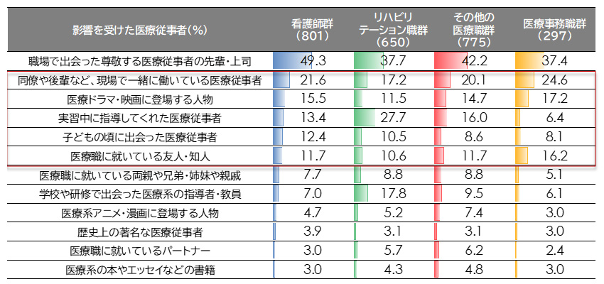 理想の医療従事者像を持つ人に、その形成に影響を与えた対象を尋ねると(図表2)、「早期志望型」の看護師群、リハビリテーション職群、その他医療職群では、「医療ドラマ・映画」「実習中の指導者」「子どもの頃に出会った医療従事者」など、教育段階で触れ得る機会の影響が相対的に高い。
