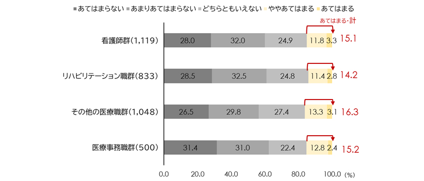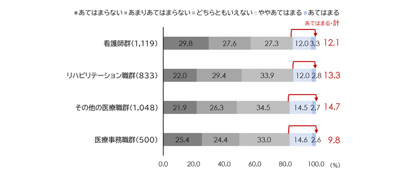 しかし、こうした安定感にも限界がある。「収入が現在の仕事に見合っている」かどうかを職種別に見ると、「あてはまる」と回答した割合は、医療事務職群で9.8%と最低水準であり、看護師群も12.1%にとどまる(図表3)。