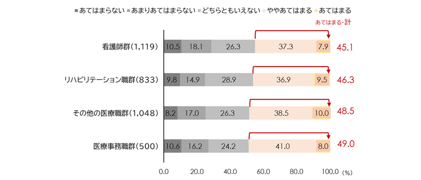 一方で、「現在の収入は安定している」と答えた割合は、看護師群45.1%、リハビリテーション職群46.3%、医療事務職群49.0%と、いずれもおよそ半数に達している(図表2)。収入額そのものには不満を抱えつつも、「給与は確実に支払われる」という安定性は一定の評価を得ているのである。