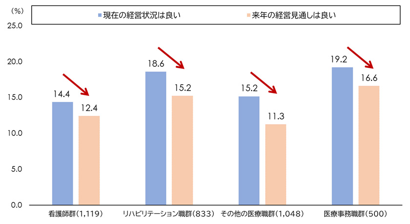 さらに、勤務先の経営状況に対する評価も厳しい。「現在の経営状況は良い」と答えた割合は看護師群で14.4%、リハビリテーション職群で18.6%にとどまる。「来年の経営見通し」について楽観視する人も極めて少ない(図表4)。