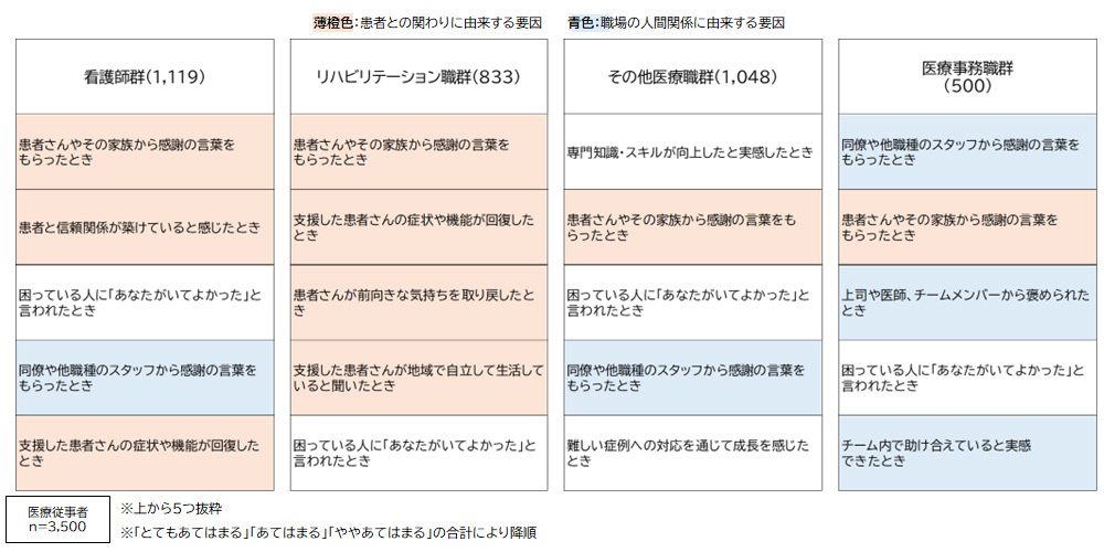 一方、その他の医療職群では「専門知識・スキルが向上したと実感したとき」が最上位に上がった。専門性を高め、その成果を発揮できることがやりがいにつながっている。医療事務職群では「同僚や他職種のスタッフから感謝の言葉をもらったとき」が上位に入り、協働や相互承認が大きな役割を果たしている。