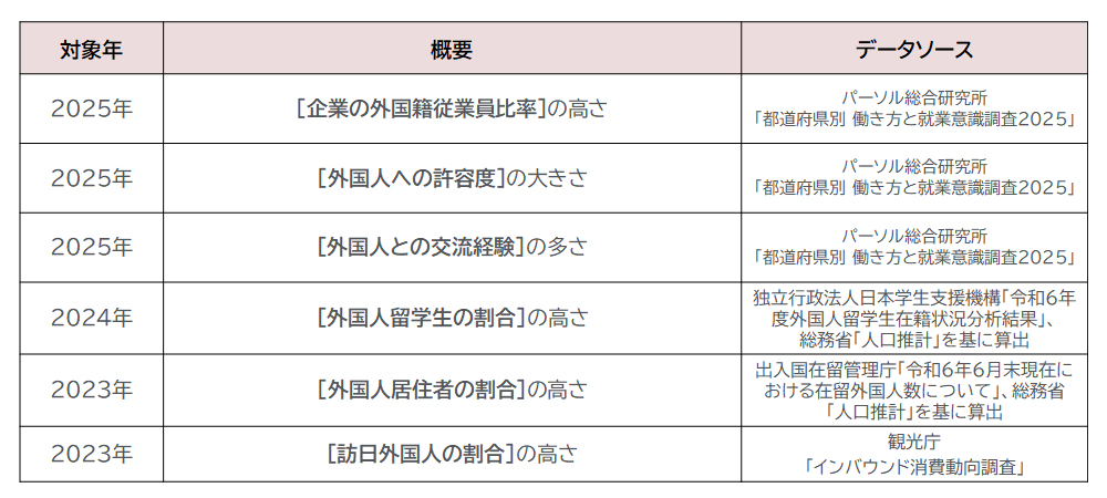 ここでは、外国人の活躍指標を図表1の6つの指標(「外国籍従業員比率」「外国人許容度」「外国人交流経験」「外国人留学生割合」「外国人居住者割合」「訪日外国人割合」)で検討している。本指標は、地域社会における「外国人の活躍度合い」を、単なる人口比率ではなく、社会・経済・文化の複合的な側面から総合的に測定するものになっている。