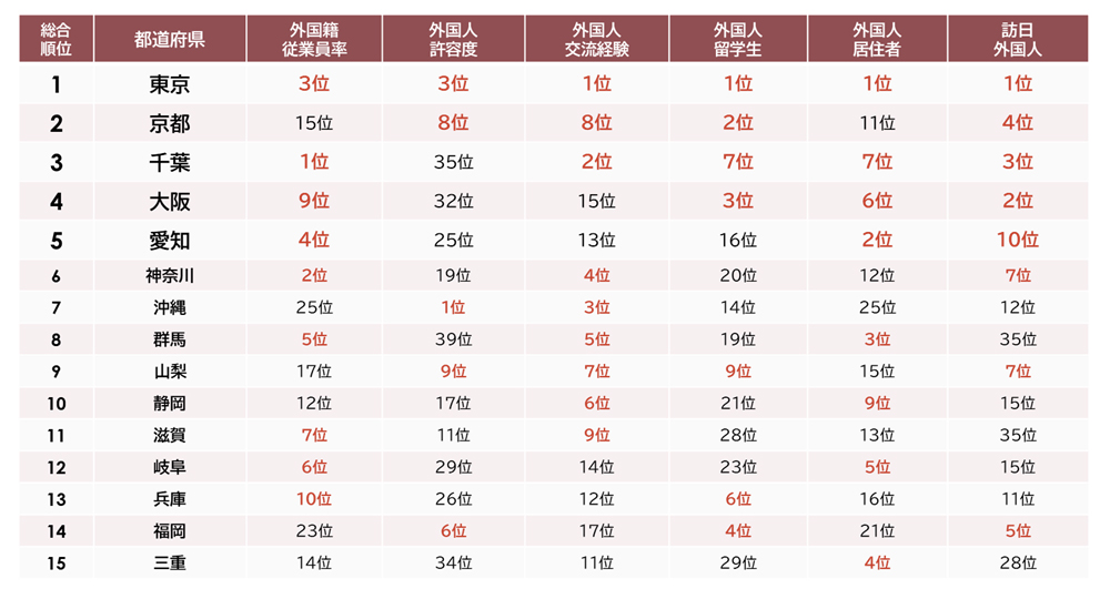 まず上位は、1位・東京、2位・京都、3位・千葉、4位・大阪、5位・愛知となった。これらはいずれも経済規模・教育機関・観光インフラが整った大都市圏であり、外国人との接点が多層的に形成されている点で共通している。