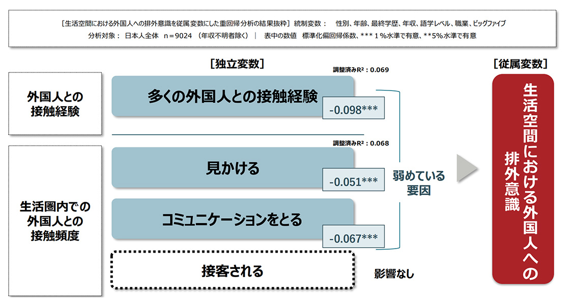 一方で、「接客される」(外国人が店員やサービス提供者として関わる)という一方向的な関係には効果が見られなかった。つまり、共生意識を育むのは「取引的接触」ではなく、相互にやり取りする関係性である。