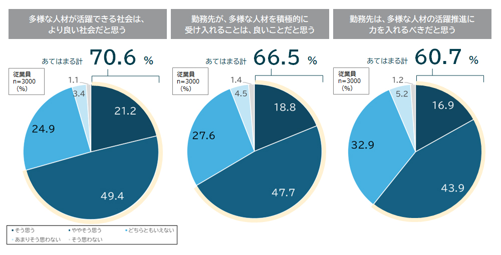 「多様な人材が活躍できる社会は、より良い社会だと思う」という項目に対し、70.6%の従業員が肯定的な回答をしている。社会的な理念としての重要性や正当性は、すでに大多数のビジネスパーソンが認めているといってよいだろう。