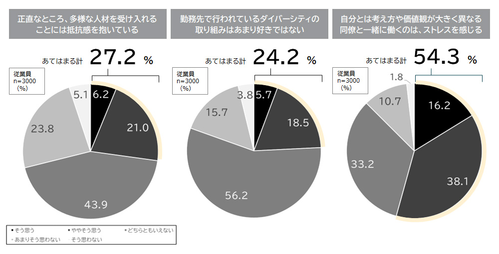ダイバーシティを推進する立場にある人事・管理部門の従業員自身もまた、掲げる理想と現場で発生する実務的な摩擦との間で、葛藤を抱えている実態が示唆されるデータといえるだろう。