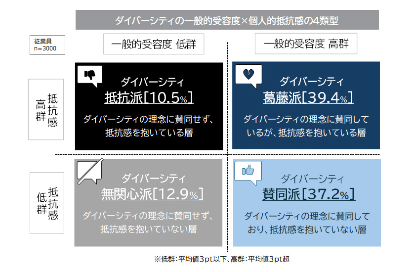この意識構造をより明確にするため、本調査では従業員を「一般的受容度」と「個人的抵抗感」の2軸で4つのタイプに分類して分析を行った(図表3)。