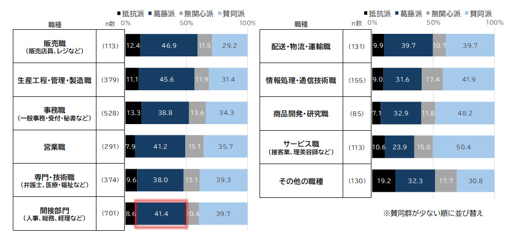職種別の傾向についても触れておきたい。「販売職」などの現場職で葛藤派が多いのは業務特性上想定されることであるが、注目すべきは「間接部門(人事、総務、経理など)」においても葛藤派が41.4%と、全職種の中で高い水準にある点だ(図表4)。