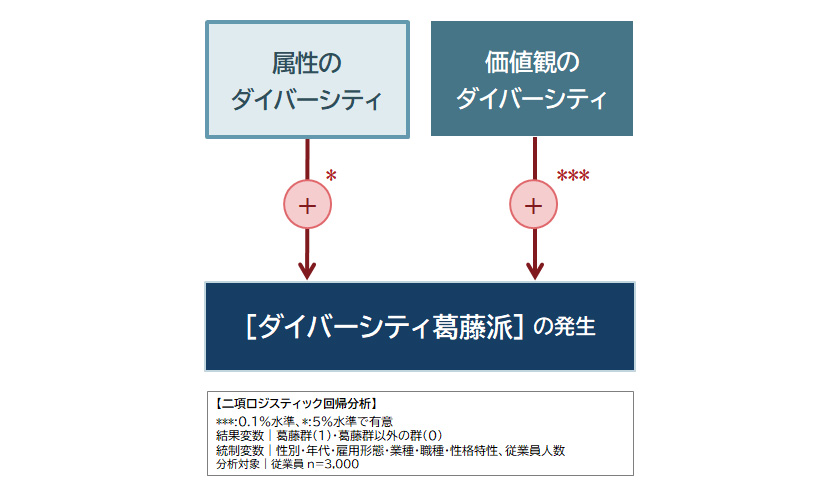 本調査では、性別や年齢といった表層的な「属性のダイバーシティ」と、考え方や経験といった深層的な「価値観のダイバーシティ」の2指標を用いて分析を行った。その結果、いずれの多様性が高まった場合でも、「ダイバーシティ葛藤派」の発生率は統計的に有意に高まることがデータからうかがえた。