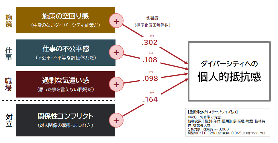 多変量解析の結果において、この「空回り感」の影響度は、現場の人間関係の摩擦(関係性コンフリクト)よりも高い数値を示した。これは、従業員がダイバーシティに抵抗を感じる主要因が、「異質な他者との協働負荷」だけではないことを示唆している。むしろ、「会社が実施している施策が表面的であり、腹落ちしない」という、施策に対する諦念やシニシズム(冷笑)こそが、ダイバーシティ推進の大きな阻害要因となっている可能性があるのだ。