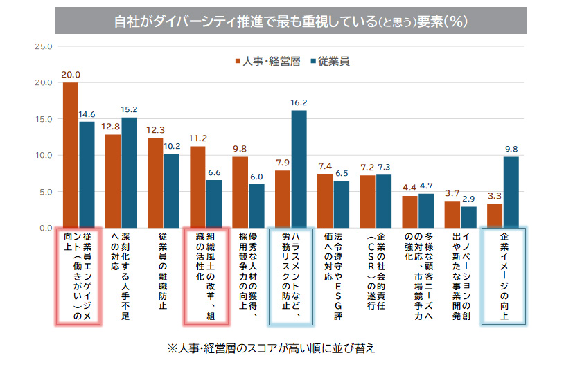 一方、従業員側に「会社が何を重視していると思うか」を尋ねると、「企業イメージの向上」や「ハラスメントなどの労務リスクの防止」「法令順守」といった、対外的な体裁や守りに関する項目が上位に挙がる。