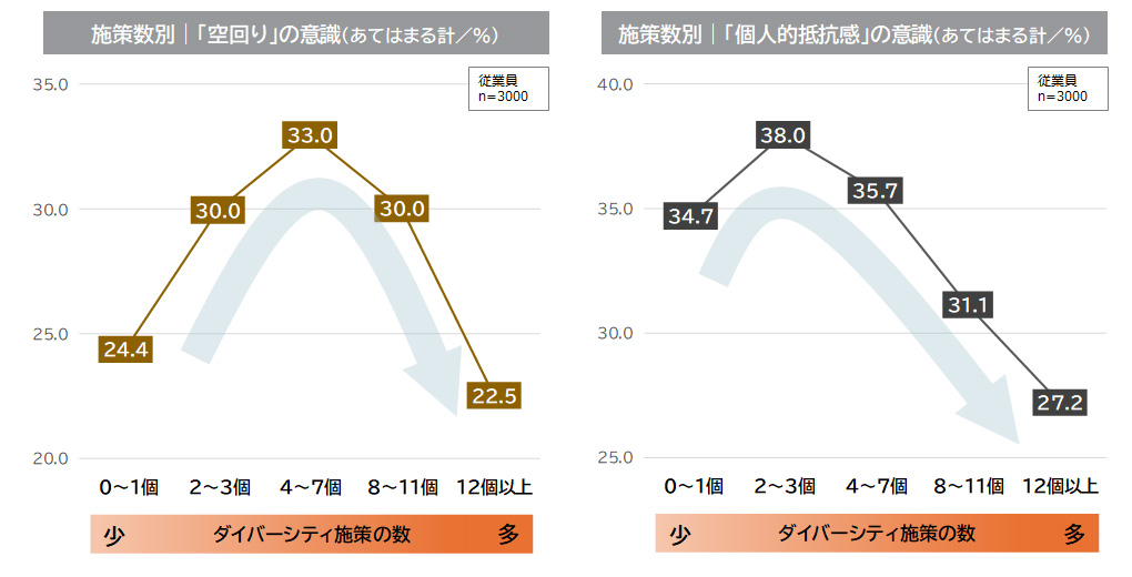 さらにデータは、ダイバーシティ施策の数が中程度の場合に、この「空回り感」や「個人的抵抗感」が最も強くなる傾向を示している(図表8)。すなわち、施策数が極端に少ない場合よりも、中途半端に形だけ整えるようなアプローチの方が、現場の負担感と「やっている感」への反発を招きやすいということだ。とりあえず制度を導入する、といった限定的な対応こそが、かえって現場の不信感を増幅させるリスクをはらんでいるといえるだろう。