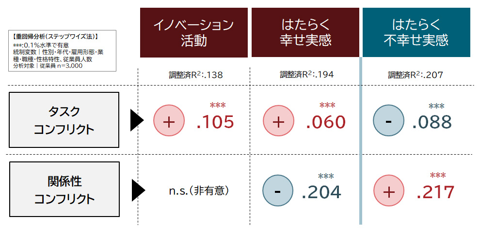 多変量解析を行ったところ、興味深い傾向が確認された。タスクコンフリクト、すなわち仕事上の意見対立は、イノベーション活動を促進し、従業員の働くことを通じて幸せを感じている「はたらく幸せ実感」を高める傾向。そして、関係性コンフリクトは、それとは真逆の傾向を示したのである(図表2)。