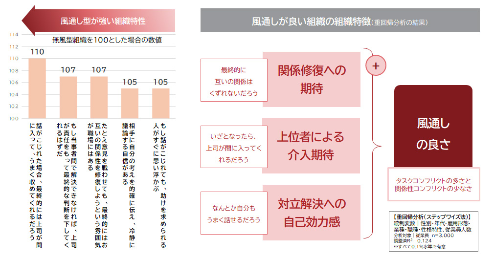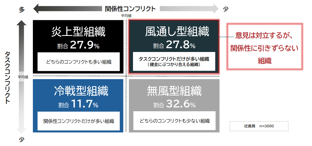 まず、本調査における「風通しの良い組織」の定義を明確にしておこう。なんとなく「仲が良い」「言いたいことが言える」といった曖昧なイメージではなく、組織内の「コンフリクト(対立)」の状態に着目することで、その実像が明確に浮かび上がってくる。