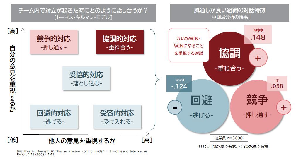 風通しの良い組織では、対立時に「回避」するのではなく、「協調的」に対話を行う傾向が強く見られた(図表6)。互いの意見を出し合い、WIN-WINの解決策を探る姿勢である。