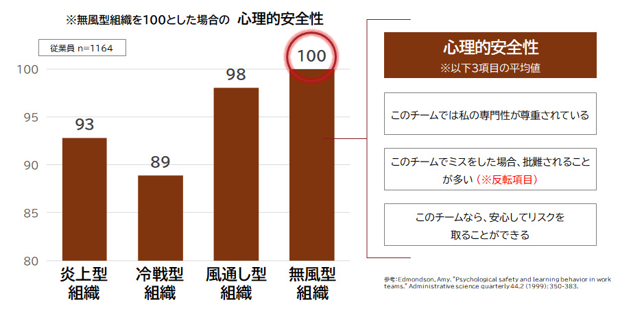 調査データを見ると、意外なことに、心理的安全性のスコアが最も高いのは「風通し型」組織ではなく、「無風型」組織だったのである(図表4)。