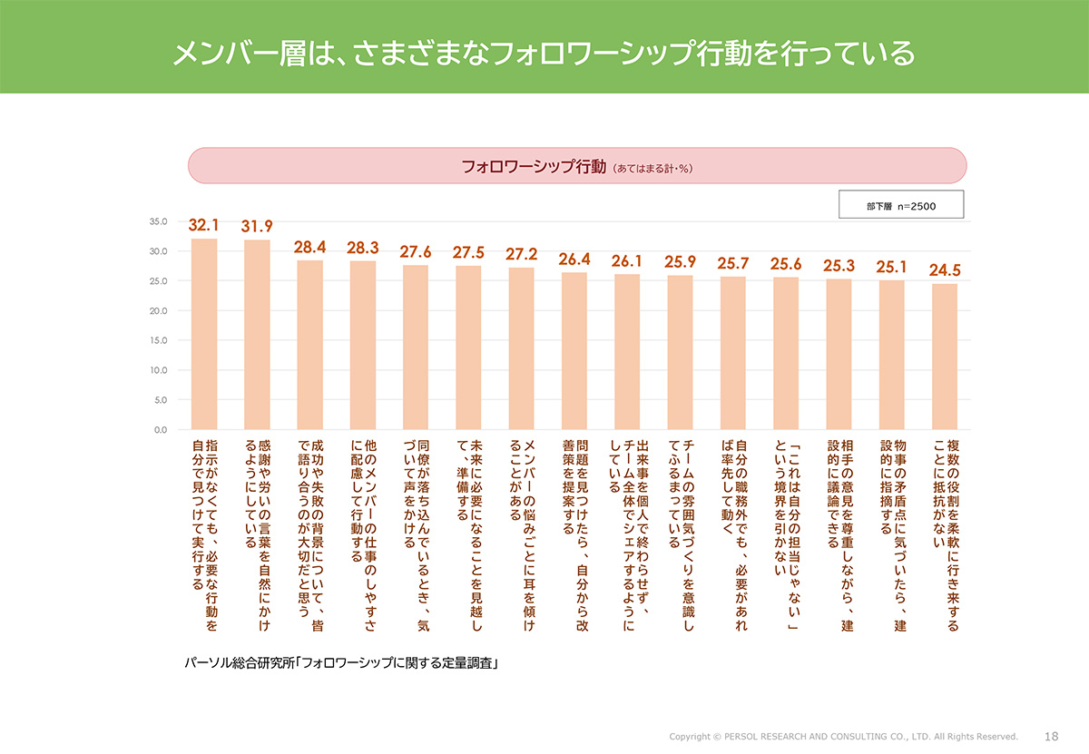 先ほどの定義に基づくフォロワーは、職場でさまざまなフォロワーシップ行動をとっています。積極的なフォロワーシップ行動の例は、「指示がなくても、必要な行動を自分で見つけて実行する」「感謝や労いの言葉を自然にかける」「成功や失敗の背景を皆で振り返る」などです。