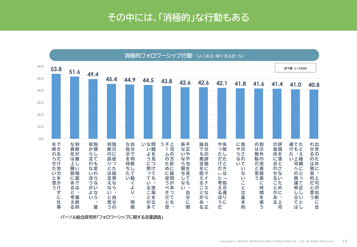 一方、消極的なフォロワーシップ行動もあります。行動自体に善悪はありませんが、主体的ではない、やや消極的な態度です。例えば、「できるだけ労力をかけずに仕事を終わらせたい」「判断が難しい場面では、最終的な責任は上司にある」「この組織は何も変わらないから言わないほうがよい」などです。これらはよくある行動です。