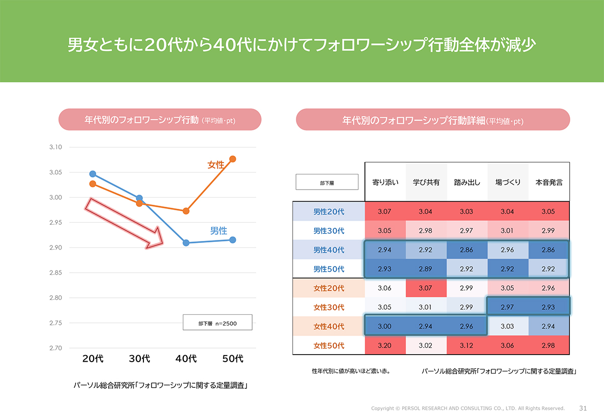 フォロワーシップ行動は、年齢が上がると低下する傾向があり、男性は下がってそのまま、女性は50代で上がります(図表17左)。ただし本調査は正規雇用者対象で、50代の正規雇用女性が積極的というセレクション・バイアスの可能性はあります。概ね、20〜30代のほうが放っておいても組織のための行動を積極的にとる傾向です。性年代別の組織パフォーマンスと結びつく5つの各行動の詳細は図表17右をご覧ください。