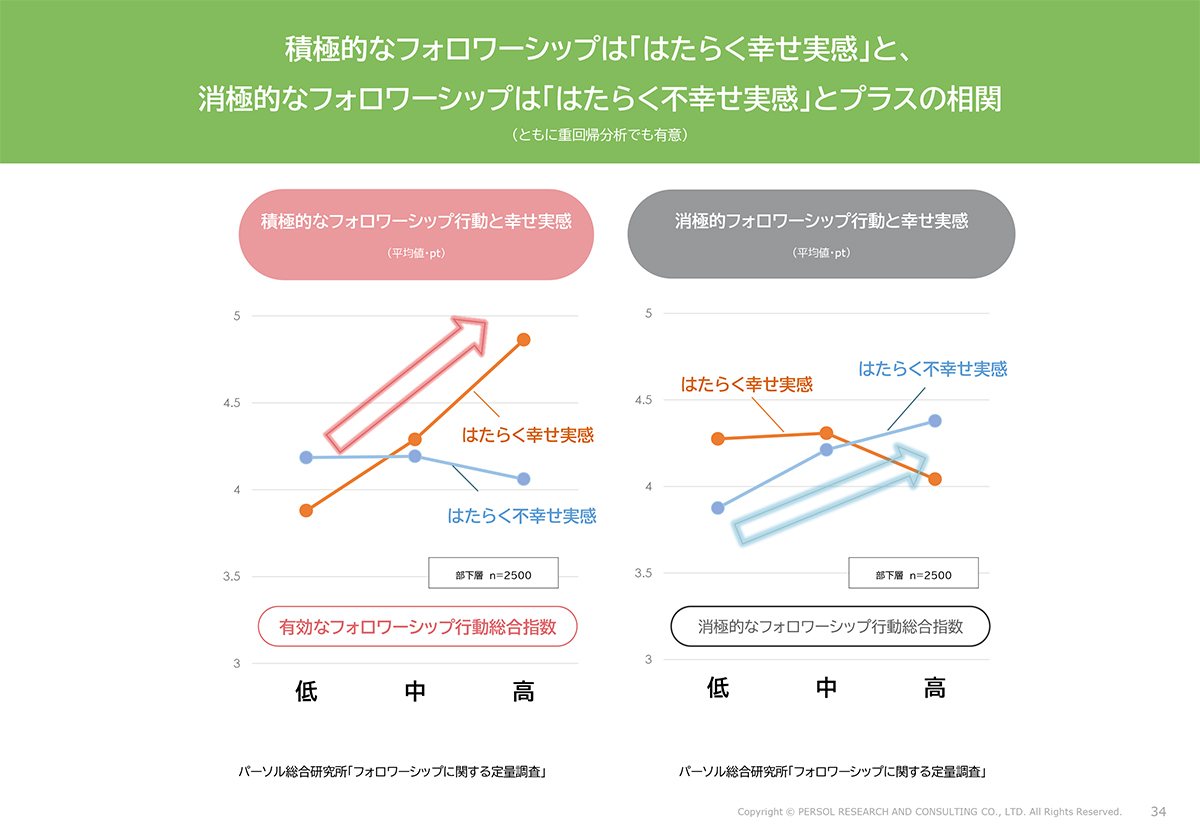 分析で興味深かったのは、フォロワーシップ行動とウェルビーイングの関係です。積極的なフォロワーシップ行動は、働くことを通じて幸せを感じている「はたらく幸せ実感」と相関し、消極的なフォロワーシップ行動は、働くことを通じて不幸せを感じている「はたらく不幸せ実感」と相関しました。積極的フォロワーシップ行動は不幸せとは関係せず、消極的フォロワーシップ行動は幸せとは関係しない。ポジはポジ、ネガはネガに結びつく傾向です。職場という人間関係の中で、どのような働きかけをしているかが、こうした「はたらく幸せ/不幸せ実感」に影響するのでしょう。