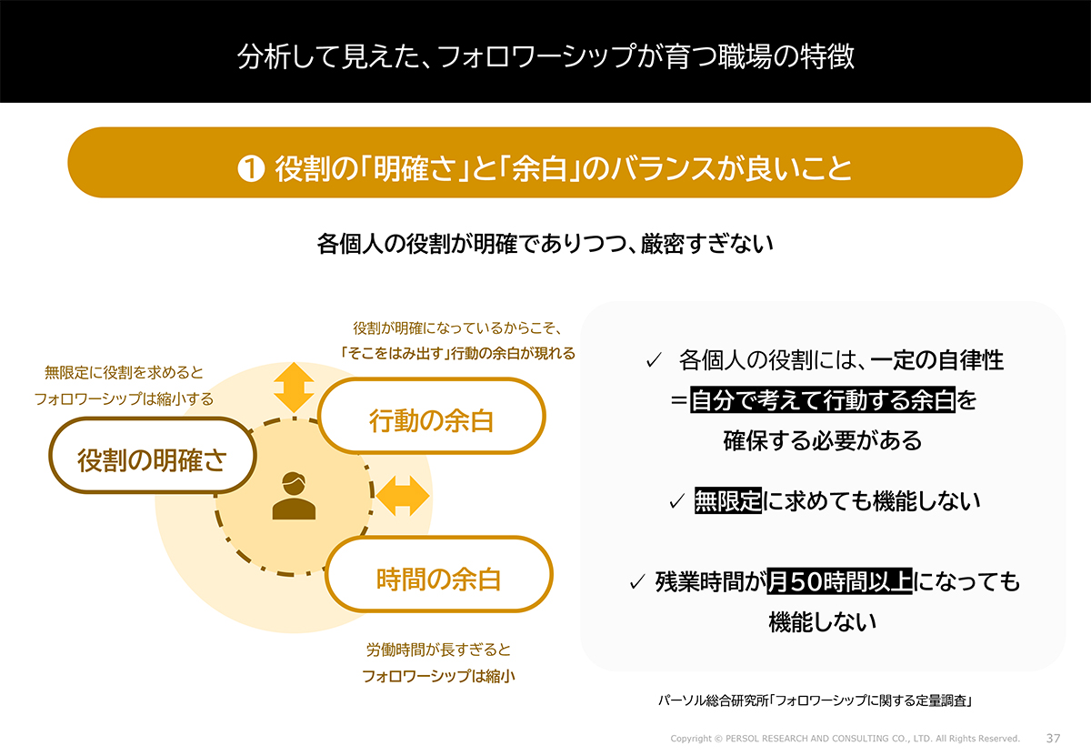 時間の余白も重要で、残業が月50時間以上だとフォロワーシップは機能していませんでした。自分の仕事で手一杯になり、フォロワーシップ行動を取る余裕がなくなるからです。自律性(自分で考えて行動する余地)を確保しつつ、無限定に求めすぎないことが鍵です。