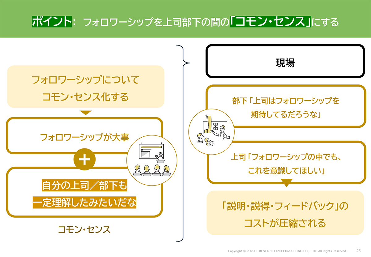 重要なポイントは「コモン・センス(共通知)」です。上司だけが知っていても、部下だけが知っていても意味が薄い。フォロワーシップ行動が重要で、会社がそれを求めていることを共通の知識にする。全員が同じ知識を知っており、相手も知っていることを互いに知っている状態を作ることが必要です。