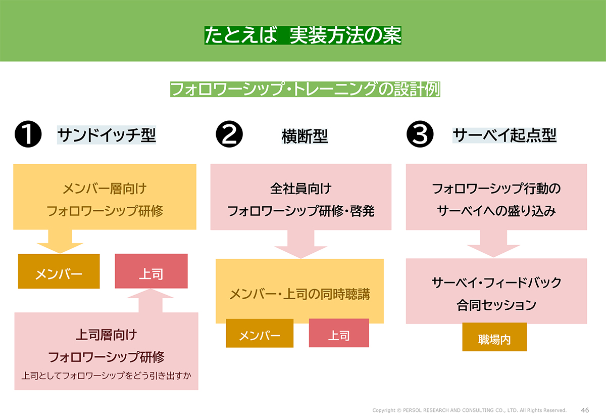 だからこそ、会社(人事)がメンバーに直接伝える仕組みが重要です。行動規範や研修、アセスメントを通じてフォロワーシップを教え、埋め込むアプローチです。新入社員の配属前研修でこうした話を取り入れてもいいでしょう。従業員サーベイに組み込む、既存のキャリア/新人研修の改定など方法は多様です。